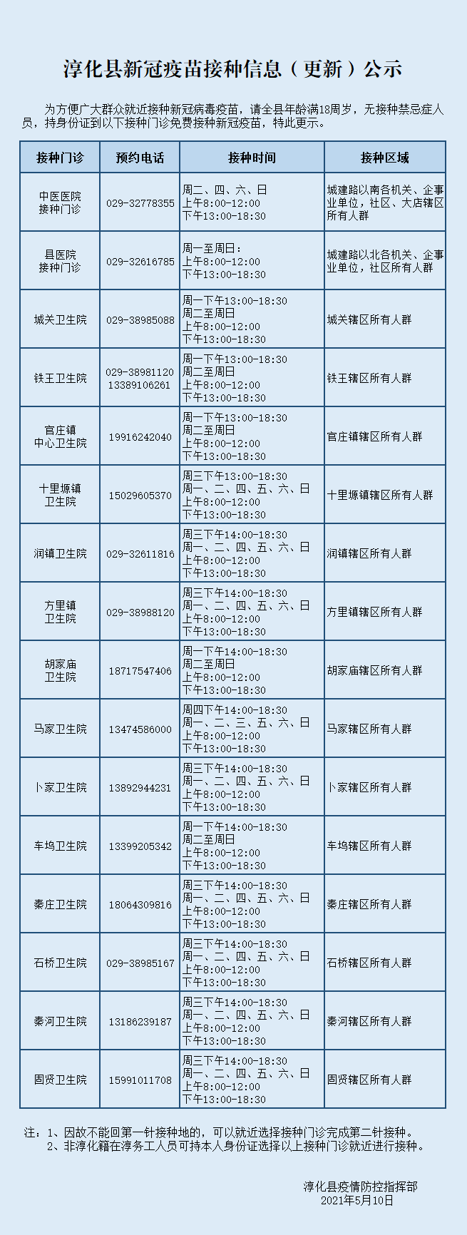 即日起,咸陽市淳化縣內18歲以上居民(含60歲以上)不論戶籍,身體狀況符合接種要求的均需免費接種新冠病毒疫苗,請您與所在單位或社區(qū)聯(lián)系疫苗接種相關事宜。零散居民、流動人口也可攜帶身份證,就近自行前往接種點接種,接種點會根據(jù)疫苗供應情況、日接種能力、排隊順序等發(fā)放接種序號。咸陽市淳化縣居民預約接種新冠病毒疫苗單位名單、地址、接種時間和預約電話等相關信息看這里↓↓↓