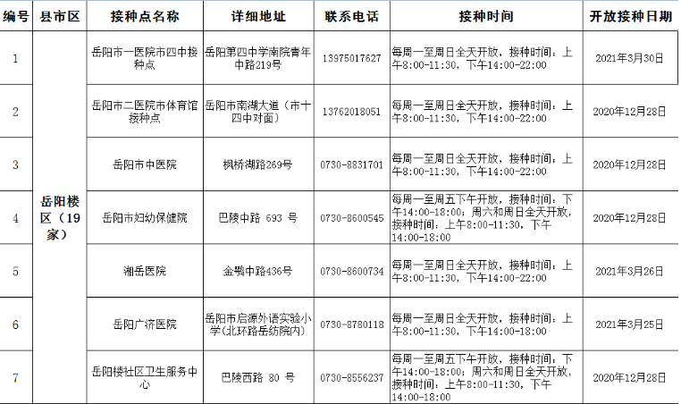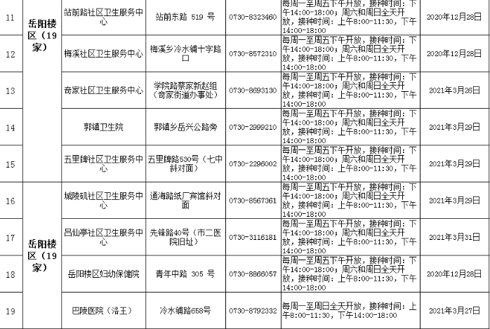 岳陽市岳陽樓區(qū)新冠病毒疫苗接種點(diǎn)信息