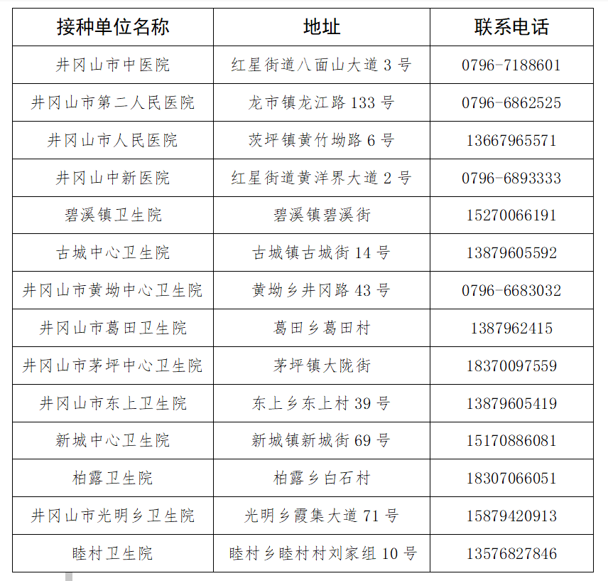 井岡山市新冠病毒疫苗接種點(diǎn)信息