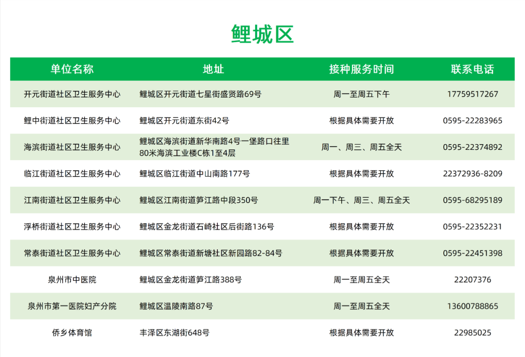泉州市鯉城區(qū)新冠病毒疫苗接種點(diǎn)信息
