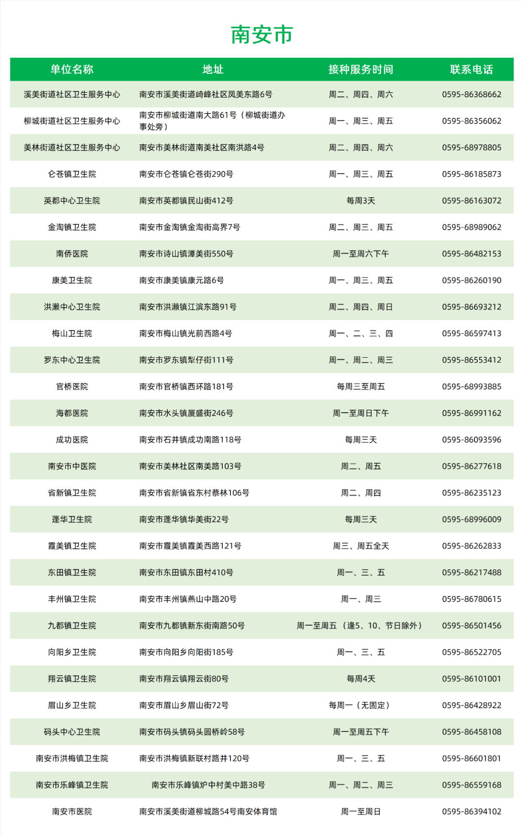 泉州市南安市新冠病毒疫苗接種點(diǎn)信息