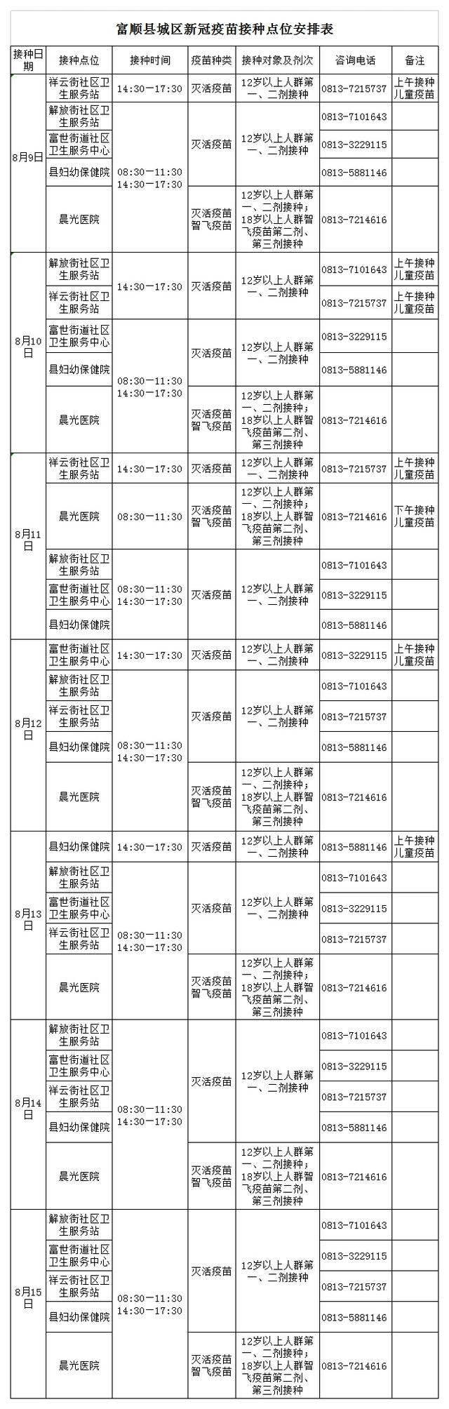 即日起,自貢市富順縣內(nèi)18歲以上居民(含60歲以上)不論戶籍,身體狀況符合接種要求的均需免費接種新冠病毒疫苗,請您與所在單位或社區(qū)聯(lián)系疫苗接種相關(guān)事宜。零散居民、流動人口也可攜帶身份證,就近自行前往接種點接種,接種點會根據(jù)疫苗供應(yīng)情況、日接種能力、排隊順序等發(fā)放接種序號。注意;接種點開放時間不定時有調(diào)整,建議先電話或者網(wǎng)上預(yù)約咨詢;自貢市富順縣新冠病毒疫苗接種單位名單、地址、接種時間和預(yù)約電話等相關(guān)信息請看這里↓↓↓