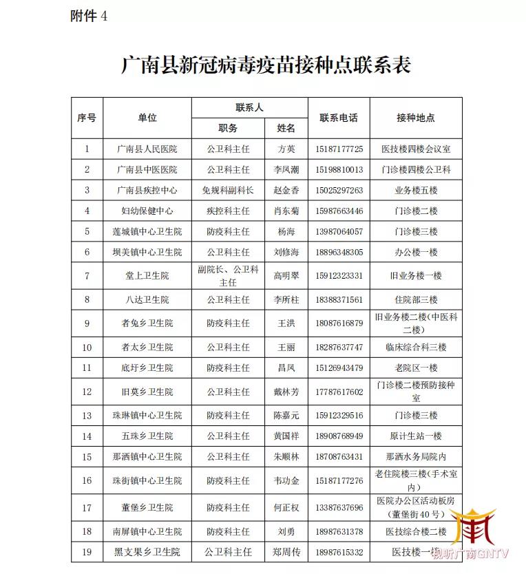 即日起,文山州廣南縣內(nèi)18歲以上居民(含60歲以上)不論戶籍,身體狀況符合接種要求的均需免費接種新冠病毒疫苗,請您與所在單位或社區(qū)聯(lián)系疫苗接種相關事宜。零散居民、流動人口也可攜帶身份證,就近自行前往接種點接種,接種點會根據(jù)疫苗供應情況、日接種能力、排隊順序等發(fā)放接種序號。注意;接種點開放時間不定時有調(diào)整,建議先電話或者網(wǎng)上預約咨詢;廣南縣疫情指揮部辦公室:0876-5890362;(疫苗接種問題反饋咨詢);廣南縣衛(wèi)生健康局:0876-5637096(疫苗接種服務咨詢);廣南縣疾病預防控制中心:0876-5158619(疫苗接種安全知識、異常反應處置技術服務咨詢)。廣南縣新冠病毒疫苗接種單位名單、地址、接種時間和預約電話等相關信息請看這里↓↓↓
