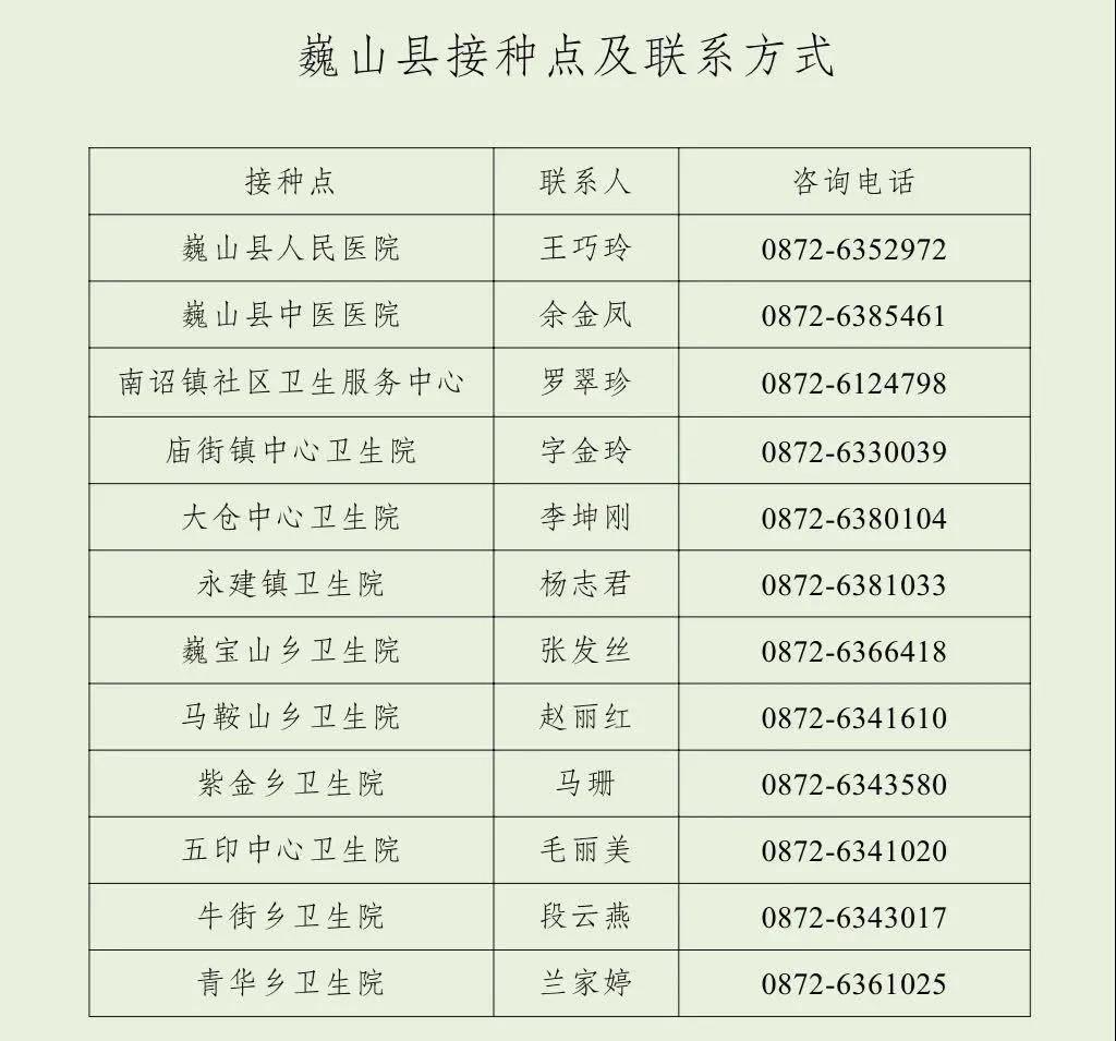 即日起,大理州巍山縣內(nèi)18歲以上居民(含60歲以上)不論戶籍,身體狀況符合接種要求的均需免費接種新冠病毒疫苗,請您與所在單位或社區(qū)聯(lián)系疫苗接種相關(guān)事宜。零散居民、流動人口也可攜帶身份證,就近自行前往接種點接種,接種點會根據(jù)疫苗供應情況、日接種能力、排隊順序等發(fā)放接種序號。注意;接種點開放時間不定時有調(diào)整,建議先電話或者網(wǎng)上預約咨詢;巍山縣疾控中心新冠病毒疫苗接種咨詢電話:0872-6124221;巍山縣新冠病毒疫苗接種單位名單、地址、接種時間和預約電話等相關(guān)信息請看這里↓↓↓