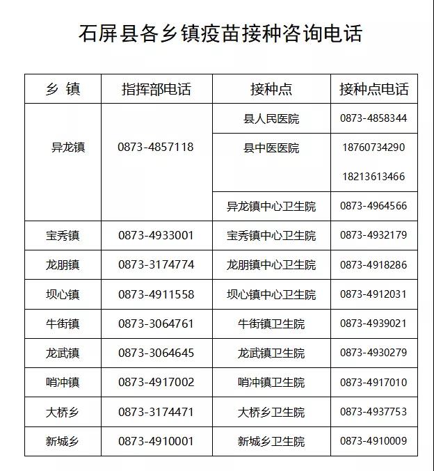 即日起,紅河州石屏縣內(nèi)18歲以上居民(含60歲以上)不論戶籍,身體狀況符合接種要求的均需免費接種新冠病毒疫苗,請您與所在單位或社區(qū)聯(lián)系疫苗接種相關事宜。零散居民、流動人口也可攜帶身份證,就近自行前往接種點接種,接種點會根據(jù)疫苗供應情況、日接種能力、排隊順序等發(fā)放接種序號。注意;接種點開放時間不定時有調(diào)整,建議先電話或者網(wǎng)上預約咨詢;石屏縣新冠病毒疫苗接種單位名單、地址、接種時間和預約電話等相關信息請看這里↓↓↓