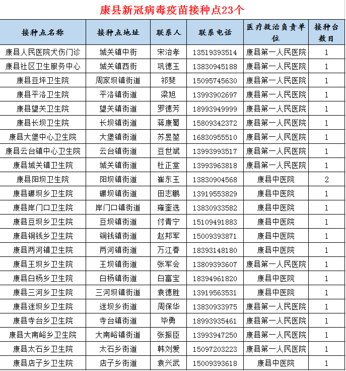 即日起,隴南市康縣內(nèi)18歲以上居民(含60歲以上)不論戶籍,身體狀況符合接種要求的均需免費接種新冠病毒疫苗,請您與所在單位或社區(qū)聯(lián)系疫苗接種相關事宜。零散居民、流動人口也可攜帶身份證,就近自行前往接種點接種,接種點會根據(jù)疫苗供應情況、日接種能力、排隊順序等發(fā)放接種序號。注意;接種點開放時間不定時有調(diào)整,建議先電話或者網(wǎng)上預約咨詢;隴南市康縣新冠病毒疫苗接種單位名單、地址、接種時間和預約電話等相關信息請看這里↓↓↓