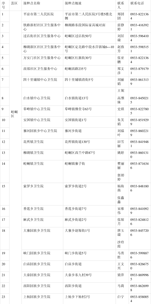 接種地點:甘肅省平?jīng)鍪?/span>崆峒區(qū)四十里鋪鎮(zhèn)清街5號