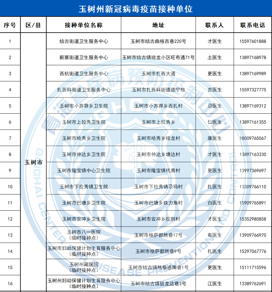 即日起,玉樹(shù)州玉樹(shù)市內(nèi)18歲以上居民(含60歲以上)不論戶(hù)籍,身體狀況符合接種要求的均需免費(fèi)接種新冠病毒疫苗,請(qǐng)您與所在單位或社區(qū)聯(lián)系疫苗接種相關(guān)事宜。零散居民、流動(dòng)人口也可攜帶身份證,就近自行前往接種點(diǎn)接種,接種點(diǎn)會(huì)根據(jù)疫苗供應(yīng)情況、日接種能力、排隊(duì)順序等發(fā)放接種序號(hào)。注意;接種點(diǎn)開(kāi)放時(shí)間不定時(shí)有調(diào)整,建議先電話(huà)或者網(wǎng)上預(yù)約咨詢(xún);玉樹(shù)州玉樹(shù)市新冠病毒疫苗接種單位名單、地址、接種時(shí)間和預(yù)約電話(huà)等相關(guān)信息請(qǐng)看這里↓↓↓