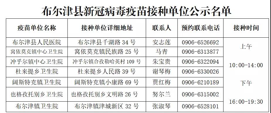 即日起,阿勒泰地區(qū)布爾津縣內(nèi)18歲以上居民(含60歲以上)不論戶(hù)籍,身體狀況符合接種要求的均需免費(fèi)接種新冠病毒疫苗,請(qǐng)您與所在單位或社區(qū)聯(lián)系疫苗接種相關(guān)事宜。零散居民、流動(dòng)人口也可攜帶身份證,就近自行前往接種點(diǎn)接種,接種點(diǎn)會(huì)根據(jù)疫苗供應(yīng)情況、日接種能力、排隊(duì)順序等發(fā)放接種序號(hào)。注意;接種點(diǎn)開(kāi)放時(shí)間不定時(shí)有調(diào)整,建議先電話或者網(wǎng)上預(yù)約咨詢(xún),阿勒泰地區(qū)疾控中心咨詢(xún)電話:0906-2111544;布爾津縣疾控中心新冠疫情防控咨詢(xún)電話:0906-6521873;阿勒泰地區(qū)布爾津縣新冠病毒疫苗接種單位名單、地址、接種時(shí)間和預(yù)約電話等相關(guān)信息請(qǐng)看這里↓↓↓
