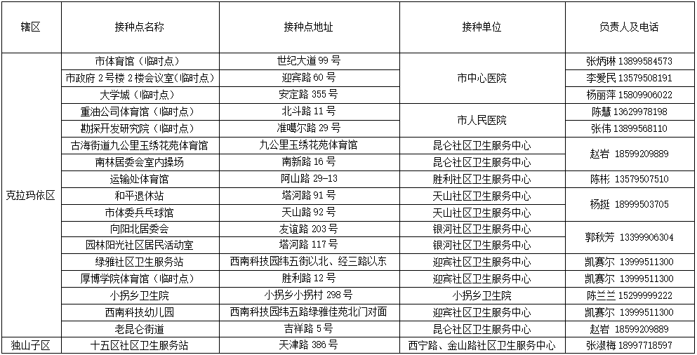 即日起,克拉瑪依市克拉瑪依區(qū)內(nèi)18歲以上居民(含60歲以上)不論戶籍,身體狀況符合接種要求的均需免費(fèi)接種新冠病毒疫苗,請(qǐng)您與所在單位或社區(qū)聯(lián)系疫苗接種相關(guān)事宜。零散居民、流動(dòng)人口也可攜帶身份證,就近自行前往接種點(diǎn)接種,接種點(diǎn)會(huì)根據(jù)疫苗供應(yīng)情況、日接種能力、排隊(duì)順序等發(fā)放接種序號(hào)。注意;接種點(diǎn)開(kāi)放時(shí)間不定時(shí)有調(diào)整,建議先電話或者網(wǎng)上預(yù)約咨詢,克拉瑪依市疫情防控工作領(lǐng)導(dǎo)小組(指揮部)咨詢電話:0990-6220530,6220580;克拉瑪依市克拉瑪依區(qū)疾控中心新冠疫情防控服務(wù)電話:0990-6240240;克拉瑪依區(qū)新冠病毒疫苗接種單位名單、地址、接種時(shí)間和預(yù)約電話等相關(guān)信息請(qǐng)看這里↓↓↓
