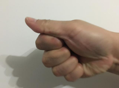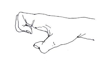 “豬蹄捶”,由勾鐮手變形而成,即把食指、中指、無名指和小指卷曲成拳形,大拇指用力直壓在食指二、三指骨彎曲處,指尖稍翹,與食指齊平,凸出于其余三指骨外。