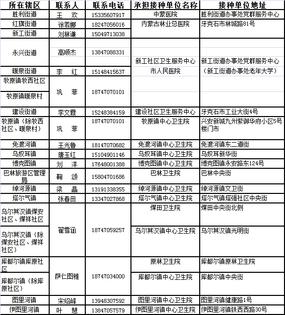 即日起,呼倫貝爾市牙克石市內(nèi)18歲以上居民(含60歲以上)不論戶籍,身體狀況符合接種要求的均需免費(fèi)接種新冠病毒疫苗,請您與所在單位或社區(qū)聯(lián)系疫苗接種相關(guān)事宜。零散居民、流動人口也可攜帶身份證,就近自行前往接種點接種,接種點會根據(jù)疫苗供應(yīng)情況、日接種能力、排隊順序等發(fā)放接種序號。注意;接種點開放時間不定時有調(diào)整,建議先電話或者網(wǎng)上預(yù)約咨詢,牙克石市疾病預(yù)防控制中心:0470-7210600;牙克石市疫情防控指揮部:0470-7206811;牙克石市新冠病毒疫苗接種咨詢電話:0470-7359906,牙克石市新冠病毒疫苗接種單位名單、地址、接種時間和預(yù)約電話等相關(guān)信息請看這里↓↓↓