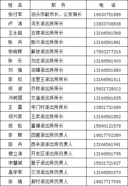 泊頭市為進(jìn)一步暢通警民溝通的聯(lián)系渠道,廣泛聽取社會(huì)各界和人民群眾對(duì)泊頭公安工作的意見、建議、投訴、舉報(bào)等,泊頭市公安局現(xiàn)將局長(zhǎng)和各派出所所長(zhǎng)的手機(jī)號(hào)碼向社會(huì)公布,您有意見、建議或者案件線索請(qǐng)及時(shí)聯(lián)系我們!讓我們攜手并肩,共建美好家園。