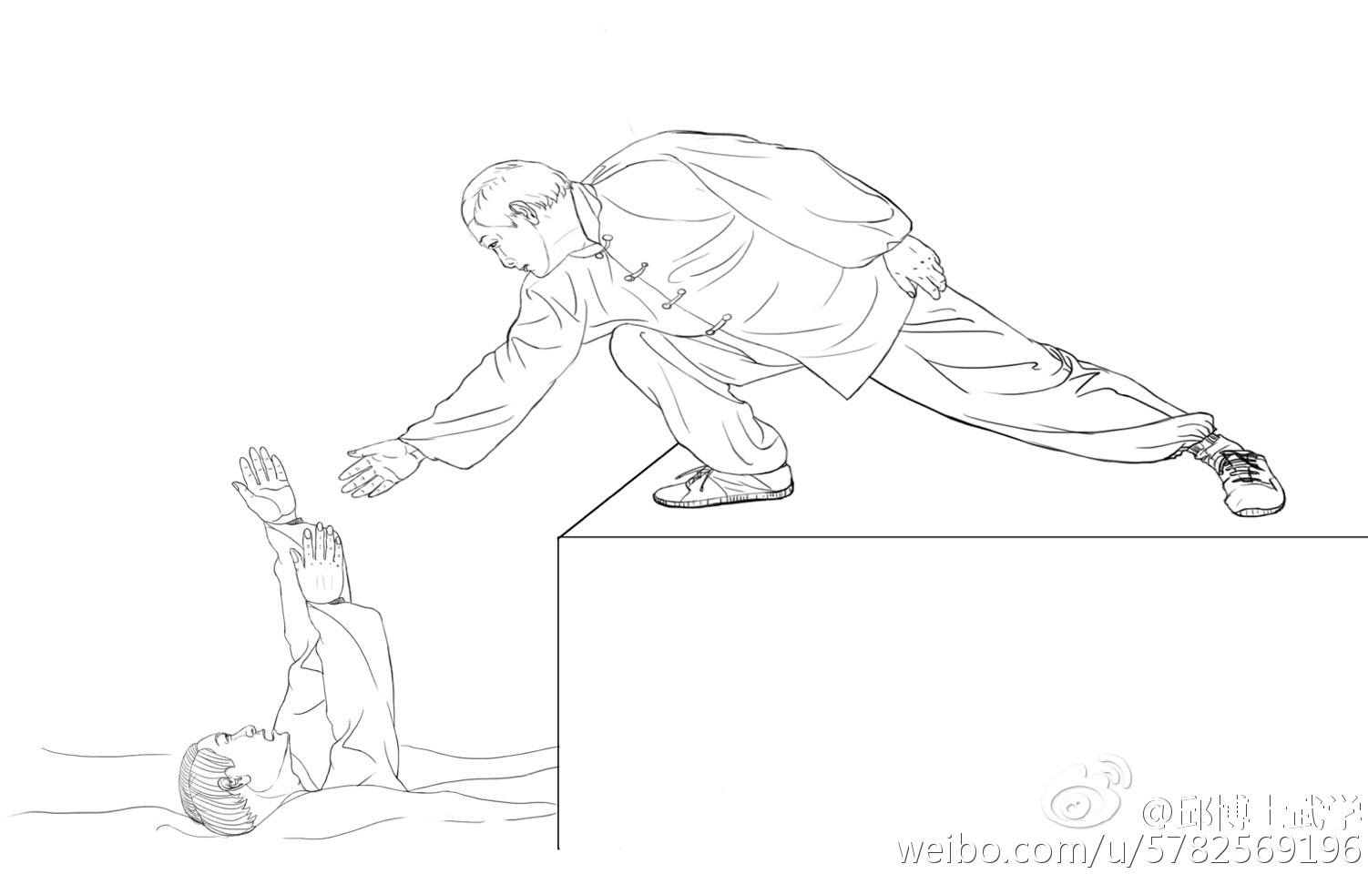 其一,伸手撈人。假如有人跌落河中,你在岸上伸手撈他,你一方面要把手伸得盡可能遠,以便能拉著落水之人,另一方面又要避免自己被對手拉下水,所以重心要盡可能后移,盡可能地站穩(wěn)。這就形成了你體內(nèi)的矛盾力,一個向前伸,一個向后退,你的身體在一條直線上同時向兩個截然相反的方向延展,拉伸得很長。