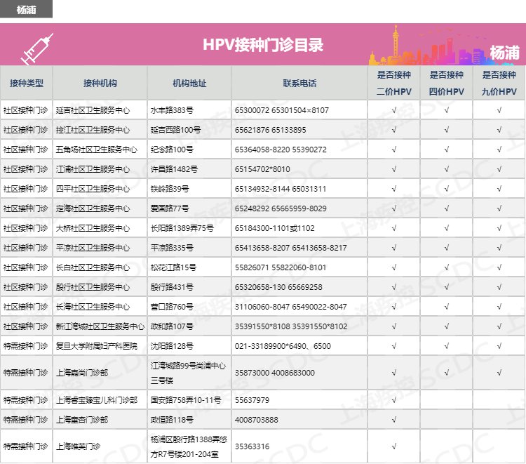 【導(dǎo)讀】:上海市楊浦區(qū)如何預(yù)約HPV二價、四價、九價宮頸癌疫苗?楊浦區(qū)宮頸癌疫苗接種點有哪些?有哪些醫(yī)院門診可以接種HPV疫苗?楊浦區(qū)宮頸癌疫苗預(yù)約電話多少?上海疾控中心公布楊浦區(qū)hpv疫苗預(yù)約接種點地址、電話、服務(wù)時間、網(wǎng)上預(yù)約流程及注意事項。有需要接種hpv疫苗的市民可咨詢了解: |