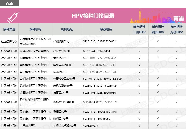 【導(dǎo)讀】:上海市青浦區(qū)如何預(yù)約HPV二價(jià)、四價(jià)、九價(jià)宮頸癌疫苗?青浦區(qū)宮頸癌疫苗接種點(diǎn)有哪些?有哪些醫(yī)院門診可以接種HPV疫苗?青浦區(qū)宮頸癌疫苗預(yù)約電話多少?上海疾控中心公布青浦區(qū)hpv疫苗預(yù)約接種點(diǎn)地址、電話、服務(wù)時(shí)間、網(wǎng)上預(yù)約流程及注意事項(xiàng)。有需要接種hpv疫苗的市民可咨詢了解: |