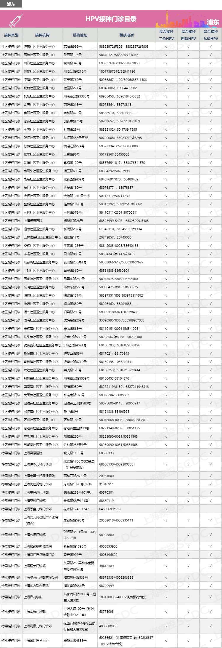 【導(dǎo)讀】:上海市浦東新區(qū)如何預(yù)約HPV二價、四價、九價宮頸癌疫苗?浦東新區(qū)宮頸癌疫苗接種點(diǎn)有哪些?有哪些醫(yī)院門診可以接種HPV疫苗?浦東新區(qū)宮頸癌疫苗預(yù)約電話多少?上海疾控中心公布浦東新區(qū)hpv疫苗預(yù)約接種點(diǎn)地址、電話、服務(wù)時間、網(wǎng)上預(yù)約流程及注意事項。有需要接種hpv疫苗的市民可咨詢了解: |