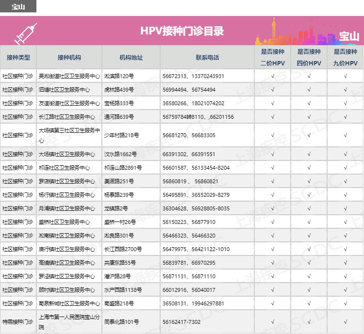 【導(dǎo)讀】:上海市寶山區(qū)如何預(yù)約HPV二價(jià)、四價(jià)、九價(jià)宮頸癌疫苗?寶山區(qū)宮頸癌疫苗接種點(diǎn)有哪些?有哪些醫(yī)院門診可以接種HPV疫苗?寶山區(qū)宮頸癌疫苗預(yù)約電話多少?上海疾控中心公布寶山區(qū)hpv疫苗預(yù)約接種點(diǎn)地址、電話、服務(wù)時(shí)間、網(wǎng)上預(yù)約流程及注意事項(xiàng)。有需要接種hpv疫苗的市民可咨詢了解: |