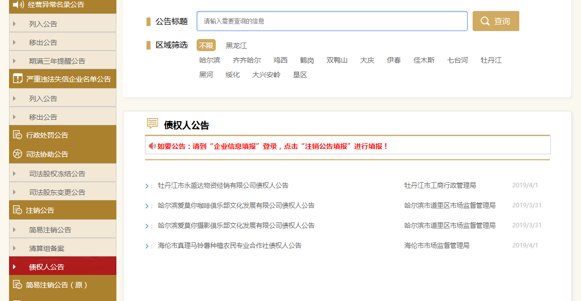 第六步,查詢公示系統(tǒng)公告所在位置:國家企業(yè)信用信息公示系統(tǒng)(黑龍江)首頁點(diǎn)擊“信息公告”,選擇“債權(quán)人公告”,輸入企業(yè)名稱即可查詢企業(yè)債權(quán)人公告信息。
