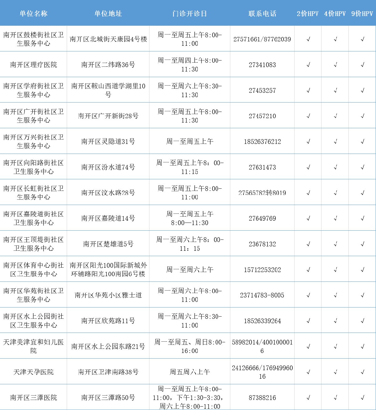 【導(dǎo)讀】:天津市南開區(qū)如何預(yù)約HPV二價、四價、九價宮頸癌疫苗?南開區(qū)宮頸癌疫苗接種點(diǎn)有哪些?有哪些醫(yī)院門診可以接種HPV疫苗?95商服網(wǎng)小編為您整理南開區(qū)hpv疫苗預(yù)約接種點(diǎn)地址、電話、服務(wù)時間、網(wǎng)上預(yù)約流程及注意事項。有需要接種hpv疫苗的市民可咨詢了解: |