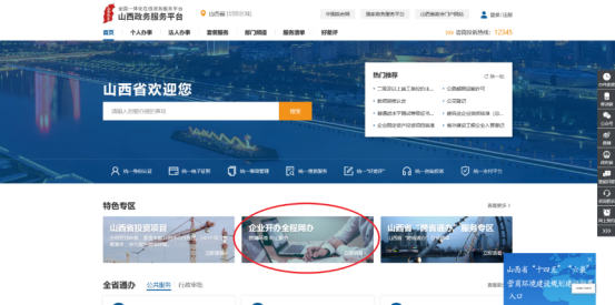 申請(qǐng)人可以通過(guò)百度搜索“山西省政務(wù)服務(wù)平臺(tái)”,或者直接在瀏覽器中輸入:http://www.sxzwfw.gov.cn/,進(jìn)入山西省政務(wù)服務(wù)網(wǎng)官網(wǎng)以后,選擇“網(wǎng)上登記全程網(wǎng)辦”模塊,訪問(wèn)網(wǎng)上登記全程網(wǎng)辦系統(tǒng)。如圖3所示: