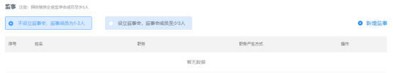 對公司的運營進行監(jiān)督,根據(jù)公司法的相關要求。我們需要選擇合適的人員進行擔任。對于小型公司,我們可以選擇不設監(jiān)事會,通過點擊新增按鈕完成監(jiān)事的錄入,如圖所示。