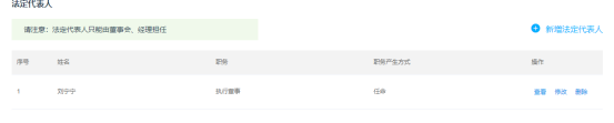 對外代表公司承擔法律責任,法人只能由董事會、經(jīng)理擔任,我們通過新增、下拉列表選擇合適的人員為公司法定代表人