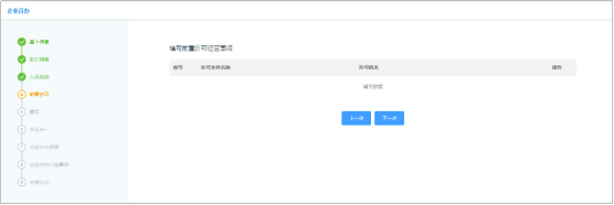 前置許可也是在設立環(huán)節(jié)的一項,此處填寫前置許可經(jīng)營事項,包含許可機關名稱、許可機關。當企業(yè)經(jīng)營范圍不涉及前置許可,用戶不填寫此項,可直接點擊“下一步”即可。