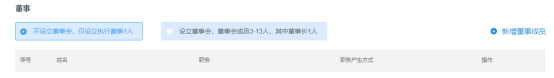 對企業(yè)規(guī)模較小的企業(yè),我們可以不設立董事會,只需要設立一名執(zhí)行董事即可。在此環(huán)節(jié)我們要勾選“不設董事會”選項,同時點擊新增按鈕,如圖所示。