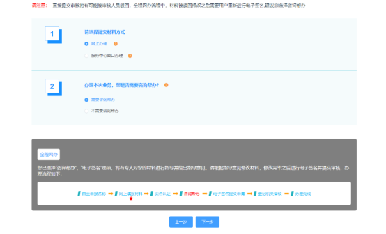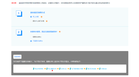 選擇“不需要咨詢幫辦”、“電子簽名”選項,需要在網(wǎng)上進行電子簽名并提交,辦理流程如下: