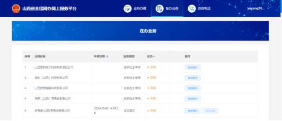當我們提交完數(shù)據(jù)后,我們通過“在辦業(yè)務”,查看我們的設立數(shù)據(jù)審批進度,如果狀態(tài)為“通過”,說明審核已經(jīng)完成