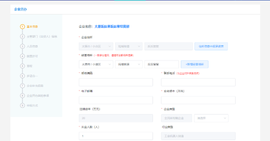 進(jìn)入設(shè)立環(huán)節(jié)后,我們第一步是需要完成基本信息的錄入,申請(qǐng)人要逐個(gè)完善相應(yīng)的內(nèi)容,如圖所示。