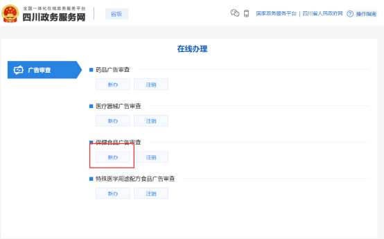 1) 保健食品廣告審查,點(diǎn)擊紅色圓圈內(nèi)的新辦