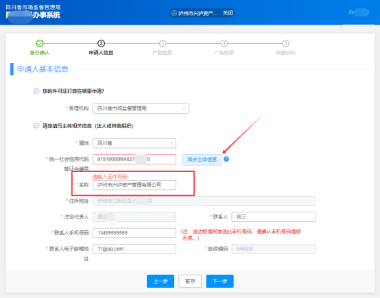3) 填寫申請(qǐng)人信息??赏ㄟ^輸入企業(yè)名稱或者統(tǒng)一信用代碼后點(diǎn)擊同步主體信息,如果不確定信息,可以先暫存,確認(rèn)信息后點(diǎn)擊下一步。