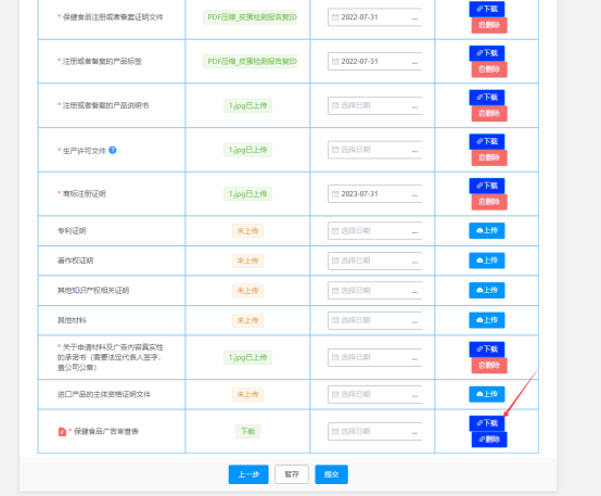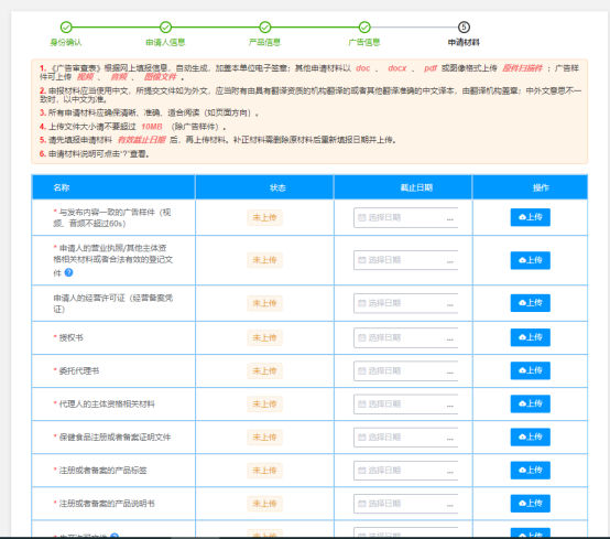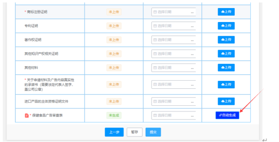 6) 上傳文件大小請(qǐng)不要超過10MB(除廣告樣件),請(qǐng)先填報(bào)申請(qǐng)材料有效截止日期后,再上傳材料。補(bǔ)正材料需刪除原材料后重新填報(bào)日期并上傳。申請(qǐng)材料說明可點(diǎn)擊“?”查看;申請(qǐng)書可點(diǎn)擊自動(dòng)生成,系統(tǒng)會(huì)根據(jù)填寫的信息自動(dòng)生成申請(qǐng)書。