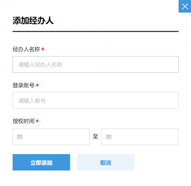 輸入法人期望授權(quán)的經(jīng)辦人名稱、登錄賬號、授權(quán)時間,點擊“立即添加”按鈕完成授權(quán)申請。