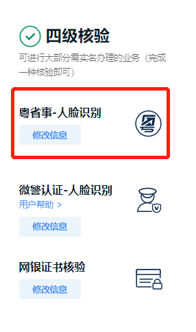 在賬戶管理頁(yè)的實(shí)名核驗(yàn)欄,在“粵省事-人臉識(shí)別”一欄,點(diǎn)擊下方按鈕(若未進(jìn)行過該級(jí)別核驗(yàn),則為“核驗(yàn)升級(jí)”;若已完成該級(jí)別核驗(yàn),則為“修改信息”)。