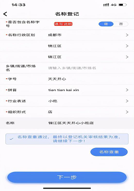 2、點(diǎn)擊進(jìn)入“個(gè)體設(shè)立”后,點(diǎn)擊“直接申請(qǐng)”跳轉(zhuǎn)個(gè)體的登記頁(yè)面。若第一項(xiàng)“是否包含名稱字號(hào)”選擇為“否”,直接點(diǎn)擊“下一步”,若選擇為“是”則按順序錄入“名稱區(qū)劃(選擇所在城市,區(qū)縣確定名稱中的行政區(qū)劃)、鄉(xiāng)鎮(zhèn)/街道/市場(chǎng)名(非必填項(xiàng))、名稱字號(hào)(自己擬定的個(gè)體名稱)、拼音、行業(yè)表述(手動(dòng)輸入搜索行業(yè)且只能選擇系統(tǒng)顯示的行業(yè),請(qǐng)注意括號(hào)內(nèi)的對(duì)應(yīng)行業(yè)描述并選擇適合的行業(yè),否則會(huì)對(duì)之后的經(jīng)營(yíng)范圍產(chǎn)生影響)、組織形式(選擇行業(yè)與組織形式一致的,系統(tǒng)會(huì)自動(dòng)去重,如要設(shè)立一戶***農(nóng)場(chǎng),行業(yè)選擇“農(nóng)場(chǎng)”、組織形式農(nóng)場(chǎng),最終名稱會(huì)自動(dòng)合并為****農(nóng)場(chǎng))”信息,如選擇完畢后下方“名稱”處會(huì)自動(dòng)出現(xiàn)申請(qǐng)的個(gè)體名稱,然后點(diǎn)擊“名稱查重”,查重通過(guò)后點(diǎn)擊進(jìn)入下一步,如下圖: