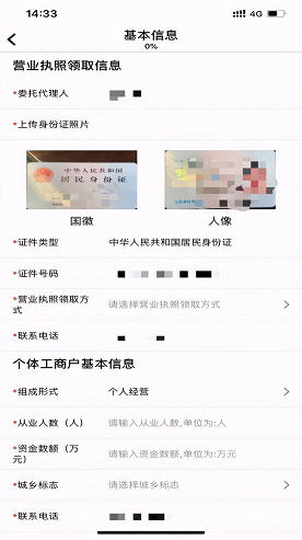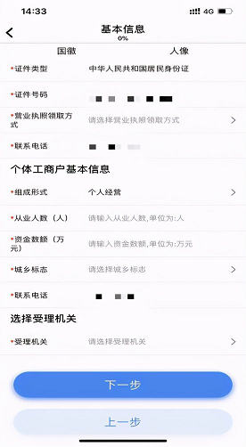 3、填報(bào)營(yíng)業(yè)執(zhí)照領(lǐng)取信息(委托代理人信息)以及個(gè)體工商戶基本信息。營(yíng)業(yè)執(zhí)照領(lǐng)取信息(委托代理人信息)默認(rèn)為登錄人信息,無(wú)法更改,領(lǐng)取方式由申請(qǐng)人自行選擇確定。個(gè)體工商戶信息將紅色星號(hào)處空格填完,其中,受理機(jī)關(guān)系統(tǒng)會(huì)根據(jù)經(jīng)營(yíng)場(chǎng)所所在市、區(qū)確定提供備選項(xiàng),申請(qǐng)人根據(jù)實(shí)際情況予以選擇,不確定的可通過(guò)“辦事咨詢——服務(wù)指南”事先電話咨詢。然后點(diǎn)擊進(jìn)入下一步,如下圖: