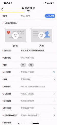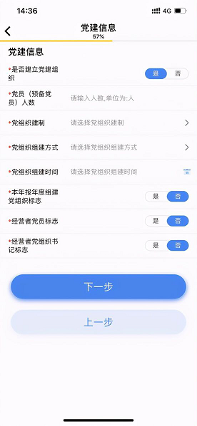 5、完善經(jīng)營(yíng)者信息、黨建信息。經(jīng)營(yíng)者信息可以直接通過(guò)“人員選擇”按鍵選擇經(jīng)辦人為經(jīng)營(yíng)者,或通過(guò)從圖片上傳身份證照片或掃描身份證原件等形式導(dǎo)入經(jīng)營(yíng)者信息,填寫標(biāo)紅星空格處之后進(jìn)入下一步完善黨建信息。黨建信息默認(rèn)為否,可直接點(diǎn)擊進(jìn)入下一步,若需要錄入黨建信息,則選擇“是”,完善標(biāo)紅星空格后,點(diǎn)擊進(jìn)入下一步,如下圖: