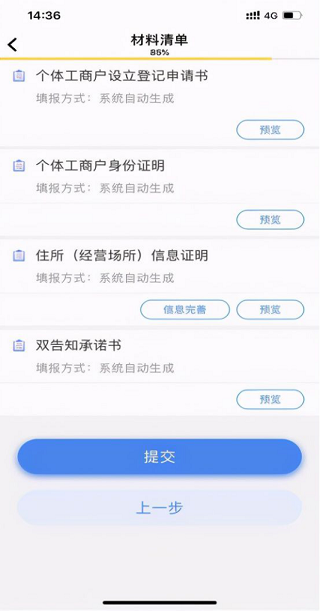 6、完善材料清單。若經(jīng)辦人與經(jīng)營(yíng)者為同一人(本人辦理的),則只需完善“住所(經(jīng)營(yíng)場(chǎng)所)信息證明”,點(diǎn)擊“信息完善”,通過(guò)下拉菜單選擇“房屋證明材料類型”、“房屋用途”,上傳照片后保存。若經(jīng)辦人與經(jīng)營(yíng)者不為同一人(委托代理人),除了完善“住所(經(jīng)營(yíng)場(chǎng)所)信息證明”,還需要完善“委托代理人證明”,點(diǎn)擊“信息完善”,根據(jù)提示填寫標(biāo)紅星空格后保存。完成上述步驟后,點(diǎn)擊提交進(jìn)入簽名環(huán)節(jié),如下圖: