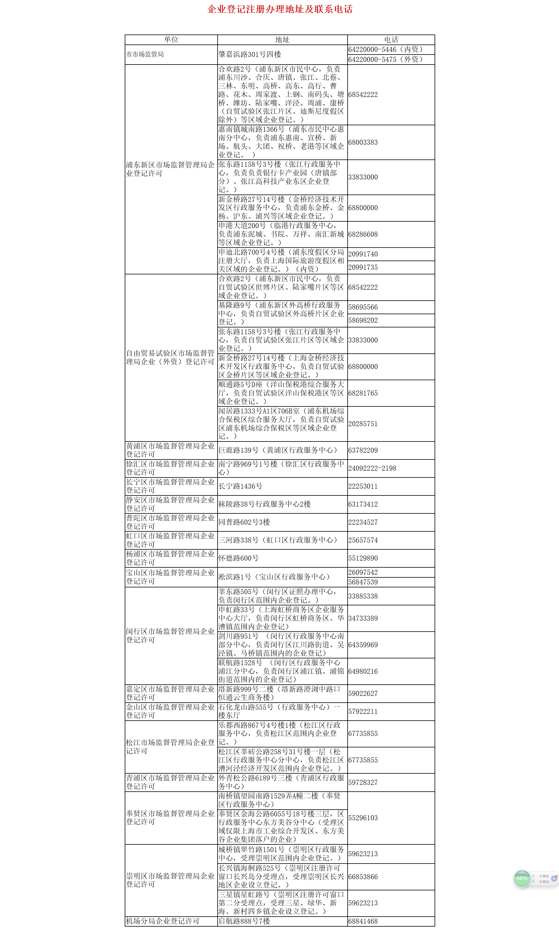 | 上海市市場監(jiān)督管理局 (企業(yè)登記注冊) | 肇嘉浜路301號四樓 | 64220000-5446(內(nèi)資) 64220000-5475(外資) | 200032 |