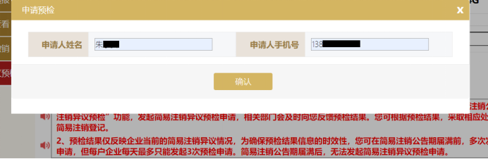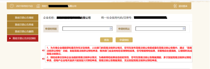 三、填報完成后,通過注銷平臺辦理跟蹤頁面 “簡易注銷異議預(yù)檢”功能,發(fā)起簡易注銷異議預(yù)檢申請及查看異議預(yù)檢結(jié)果。