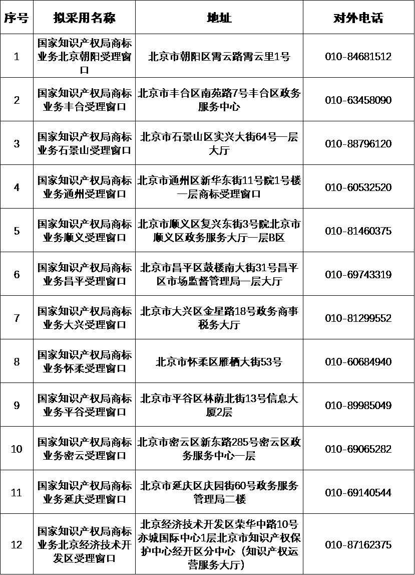 國家知識產(chǎn)權(quán)局商標(biāo)業(yè)務(wù)北京受理窗口信息表
