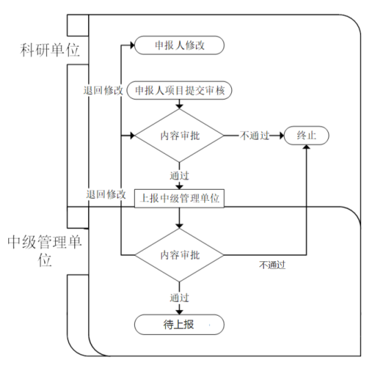 此功能用于科研單位,在申報期內(nèi),對所屬本單位的申報人提交申報的項目進行審批處理。審批流程由向上的逐級審批上報和向下的逐級退回修改組成,詳細(xì)流程如下圖所示: