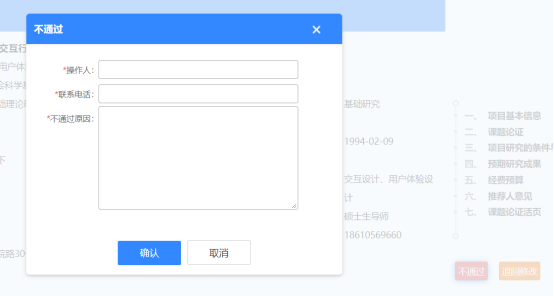 6)點擊“不通過”按鈕,執(zhí)行項目審核不通過操作,如下圖所示: