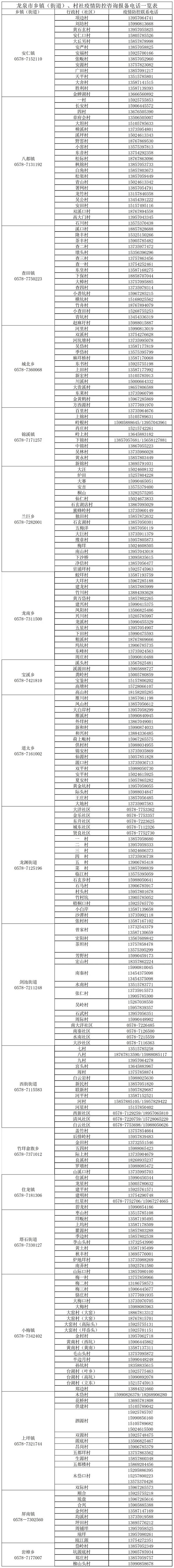 為便于廣大市民及時(shí)咨詢(xún)最新防疫政策及來(lái)龍返龍相關(guān)事宜更好地落實(shí)疫情防控各項(xiàng)措施,咨詢(xún)疫情防控政策,現(xiàn)將龍泉市行政村(社區(qū))疫情防控報(bào)備電話(huà)公示如下:
