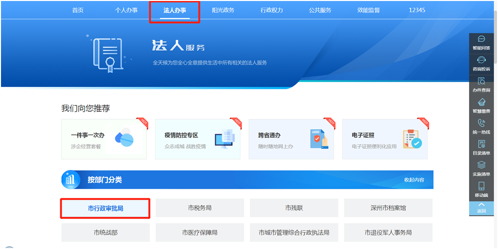 2、點擊“個人辦事”、“法人辦事”或“行政權(quán)力”,跳轉(zhuǎn)至事項辦理頁面,可按照“主題”或“部門”進(jìn)行選擇。