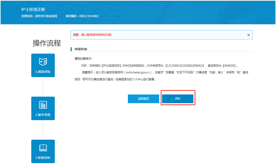 8、系統(tǒng)自動生成“申報告知單”,包括“辦件申報號、查詢密碼”等信息,事項申報流程結(jié)束,請妥善保存申報號及密碼。并點擊評價,進(jìn)行評價。
