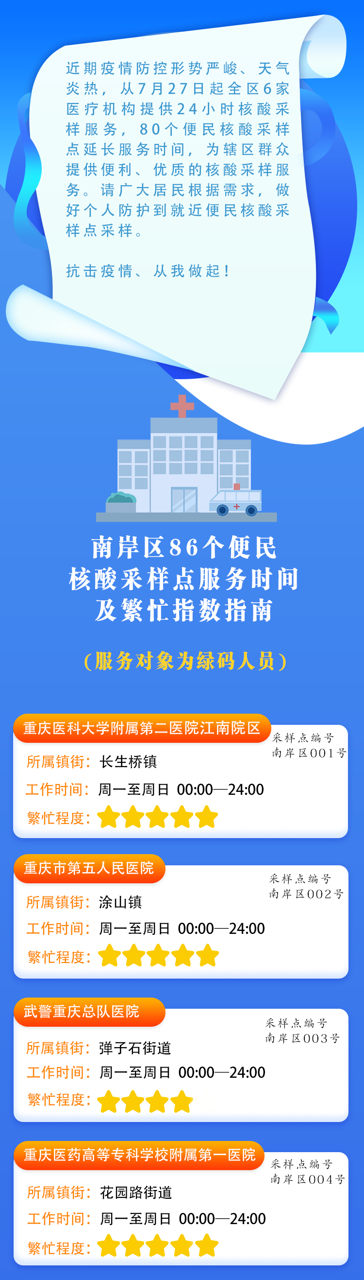 近期疫情防控形勢嚴(yán)峻、天氣炎熱,從7月27日起全區(qū)6家醫(yī)療機構(gòu)提供24小時核酸采樣服務(wù),80個便民核酸采樣點延長服務(wù)時間,為轄區(qū)群眾提供便利、優(yōu)質(zhì)的核酸采樣服務(wù)。請廣大居民根據(jù)需求,做好個人防護到就近便民核酸采樣點采樣??箵粢咔椤奈易銎?!